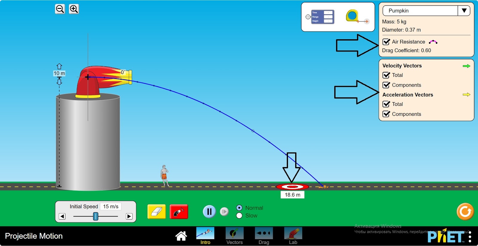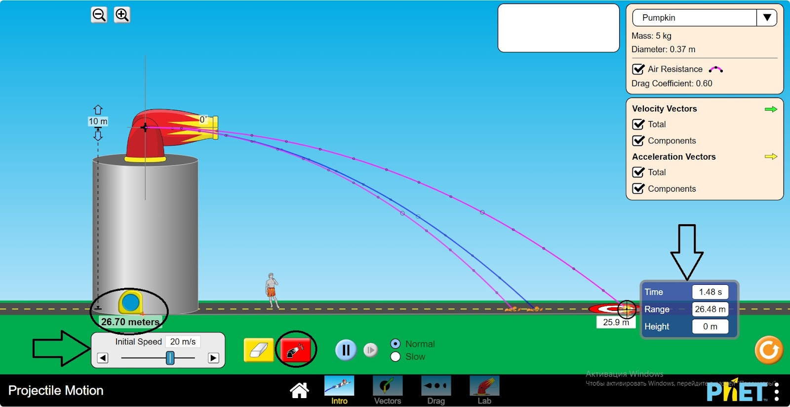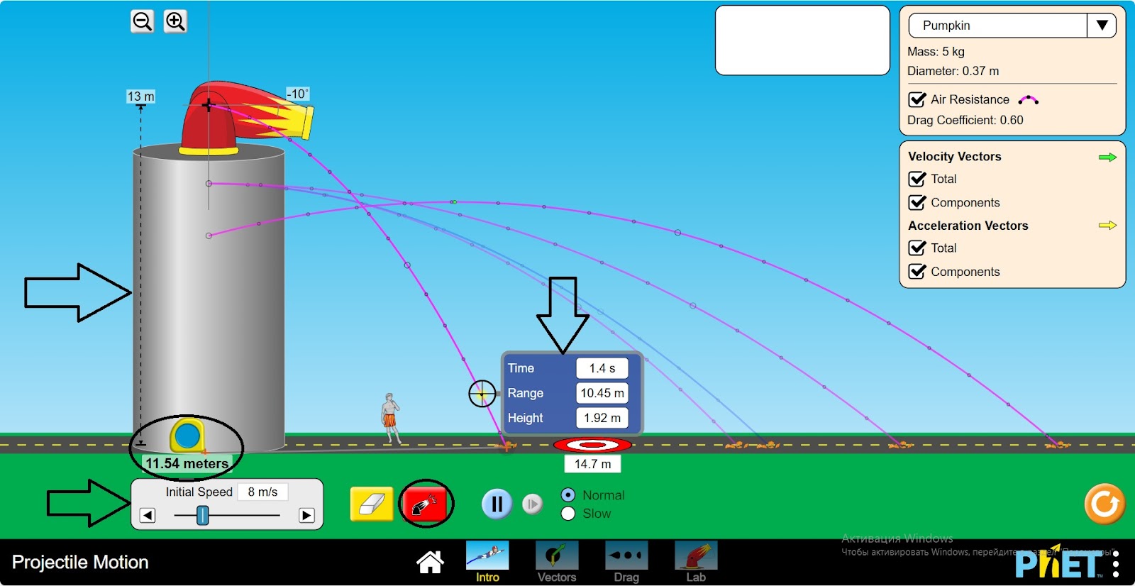 Шаг 3. Стреляйте снарядом. Объект-тыква. Используя инструменты исследования, измерьте время, пройденный путь, высоту, расстояние.