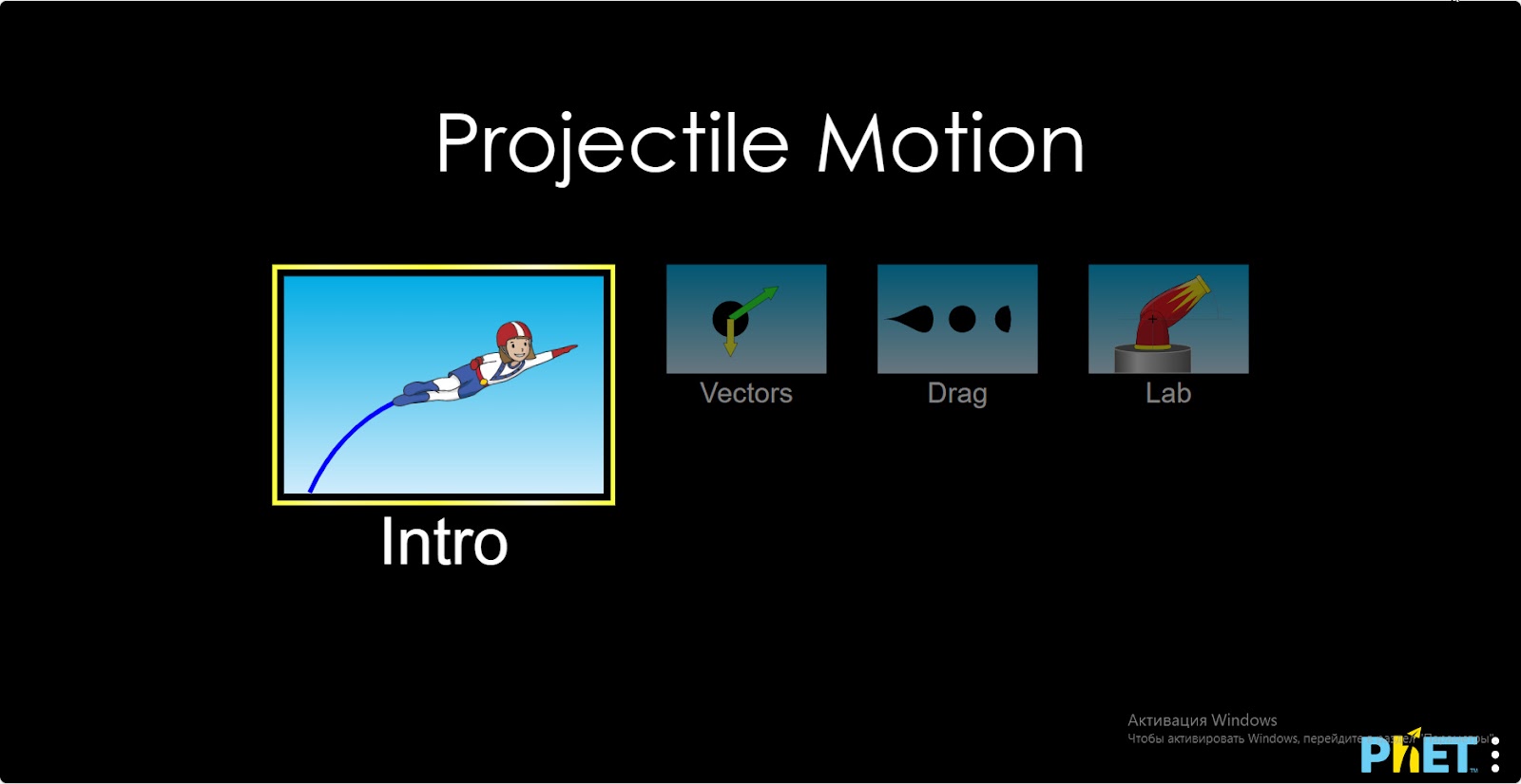 Шаг 1. Запустите симуляцию: вам будет предложено 4 различных режима: “Intro”, “Vectors”, “Drag” и “Lab”. В этой работе вы работаете в режиме “Intro”. Откройте раздел “Intro”.