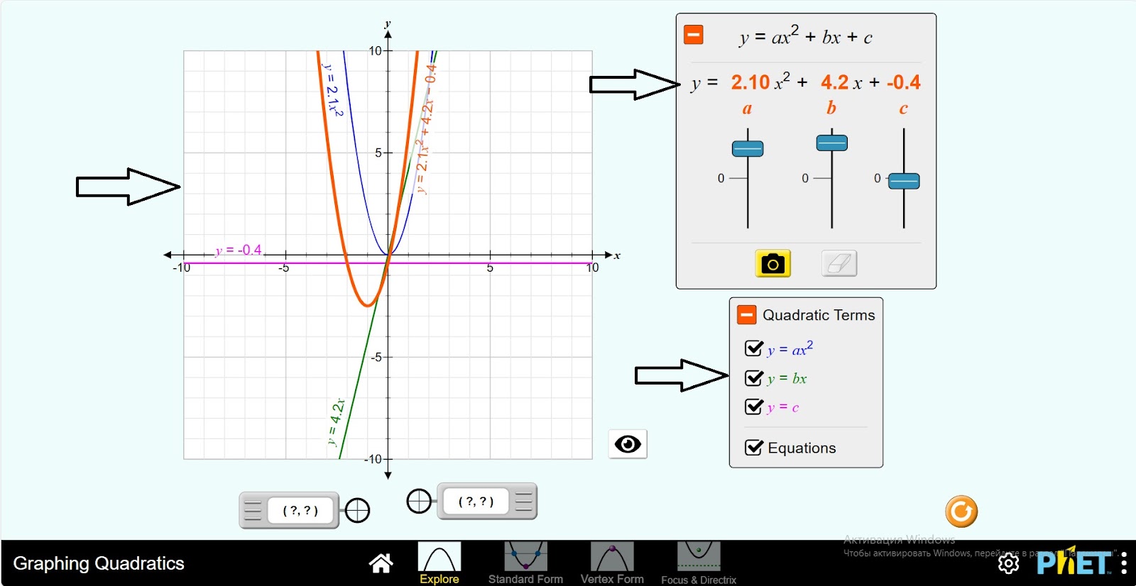 Симулятор Graphing Quadratics позволяет учащимся исследовать график квадратичной функции.  На экране Explore (исследование) учащиеся могут использовать ползунки для изучения влияния каждого члена квадратичной функции на график параболы. На экране Standard Form (стандартная форма) основное внимание уделяется главной точке, оси симметрии. Учащиеся могут настраивать функцию, но значения ограничены целыми числами.