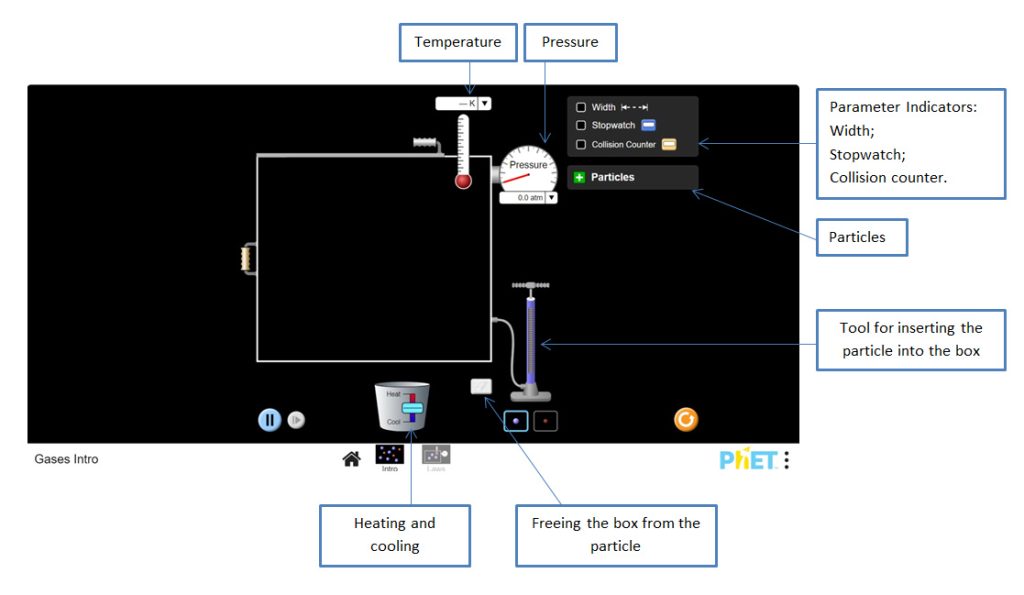 Step 5. Insert the parts into the box using the part insertion tool. The blue particles are heavier. You can see how many of them there are in the particles section. And you can track the temperature and pressure changes inside the box.